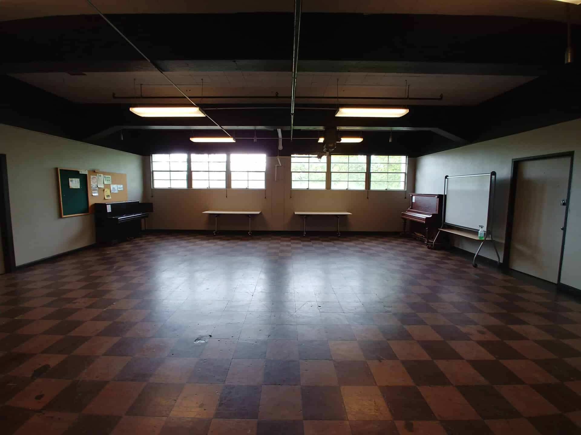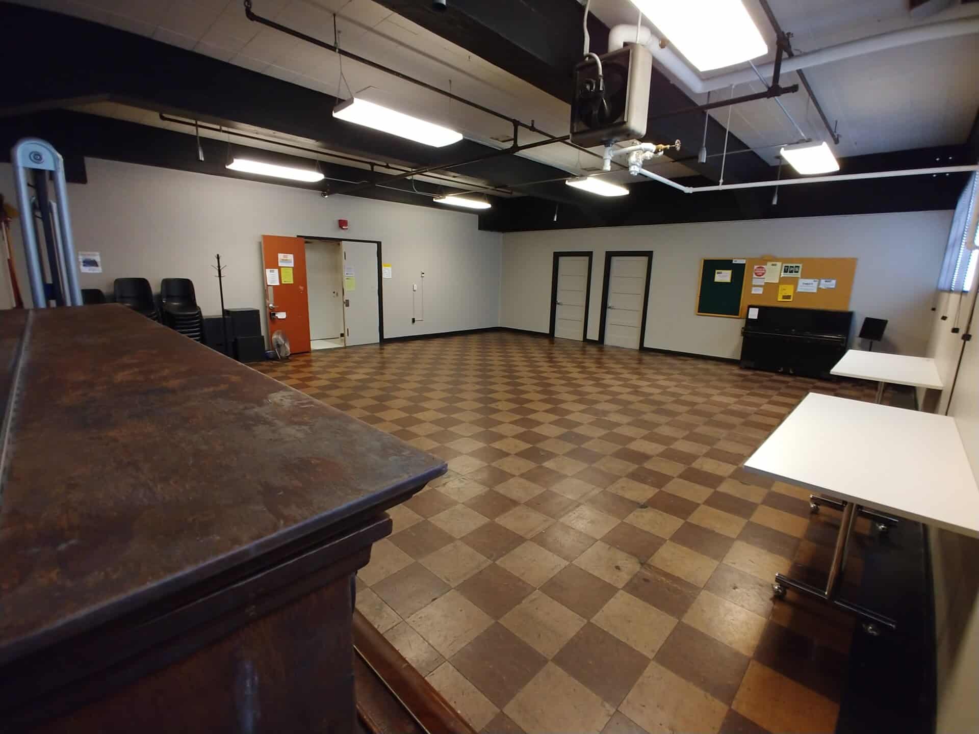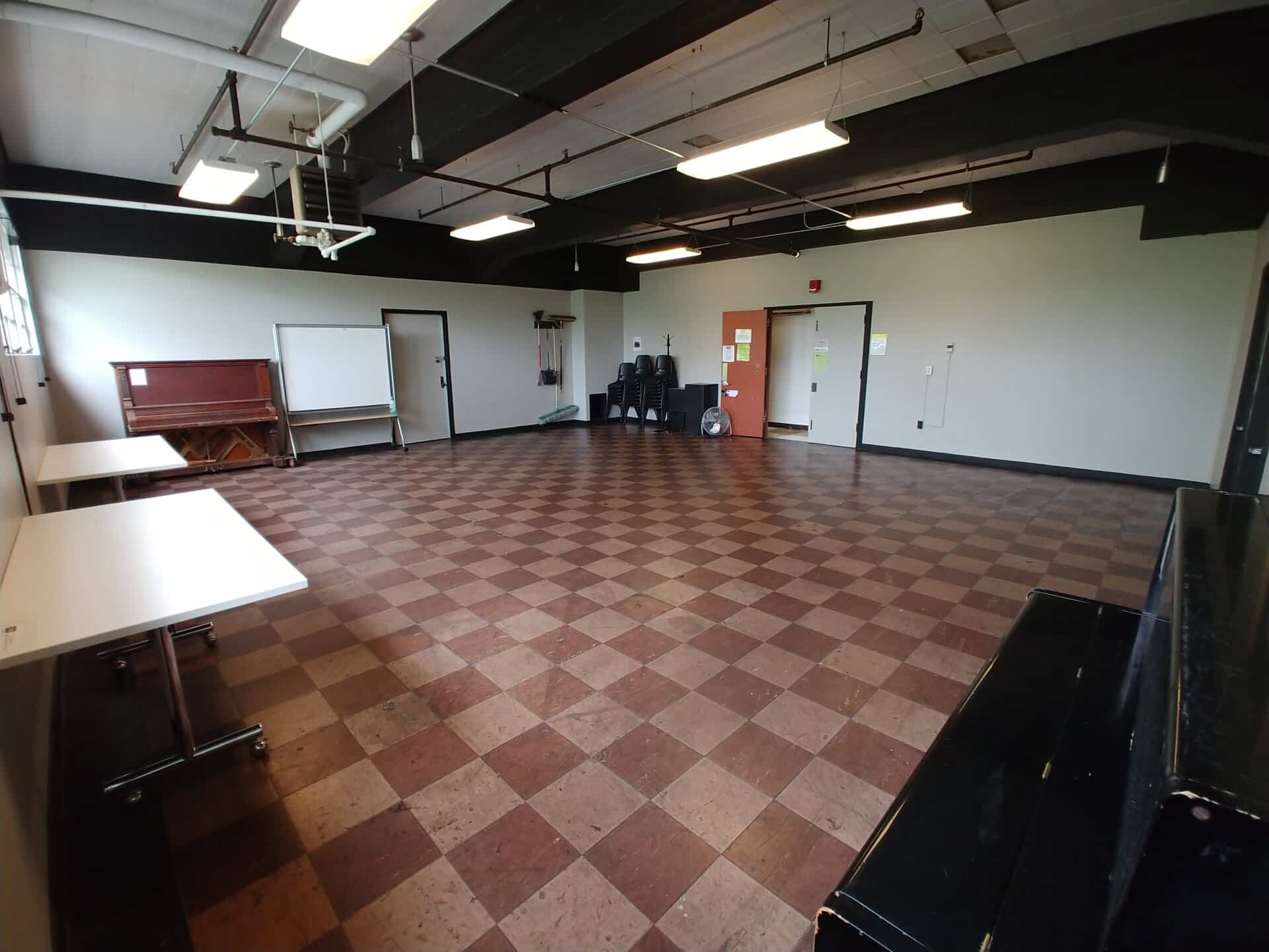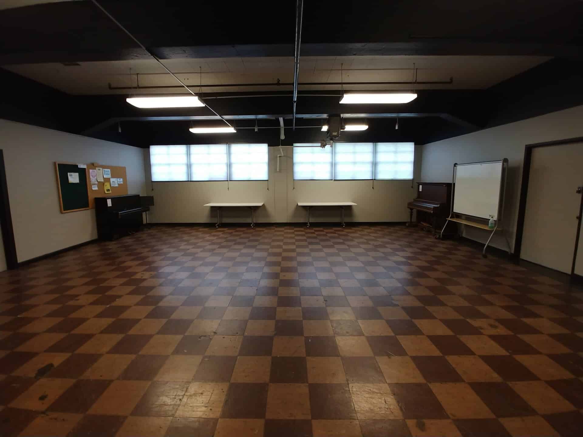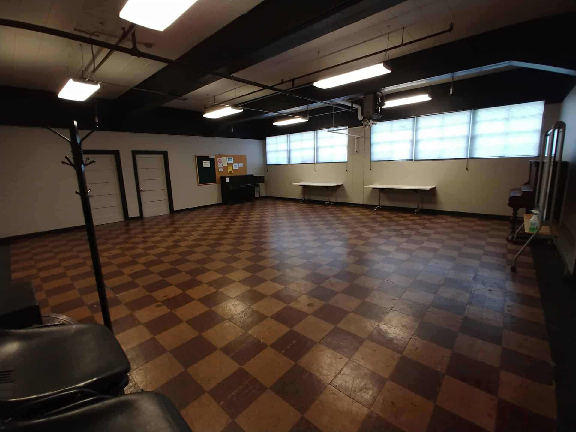 This studio has a lot of charm with its vintage linoleum tile floors and western facing windows. It is large enough for groups to rehearse in, but retains a cozy, warm feeling. This space has no mirrors, but is host to an upright piano that is a favorite for photographers and models.