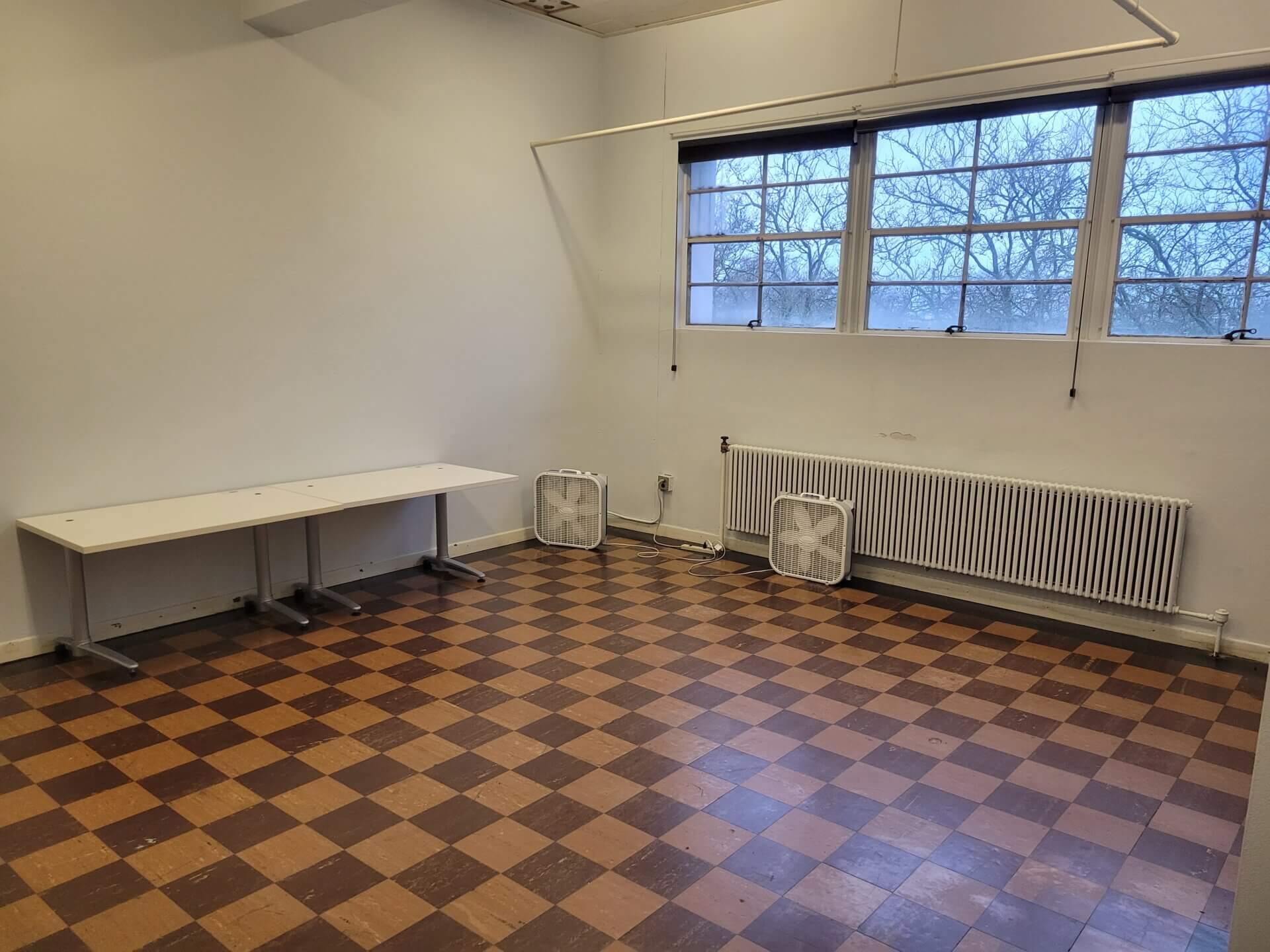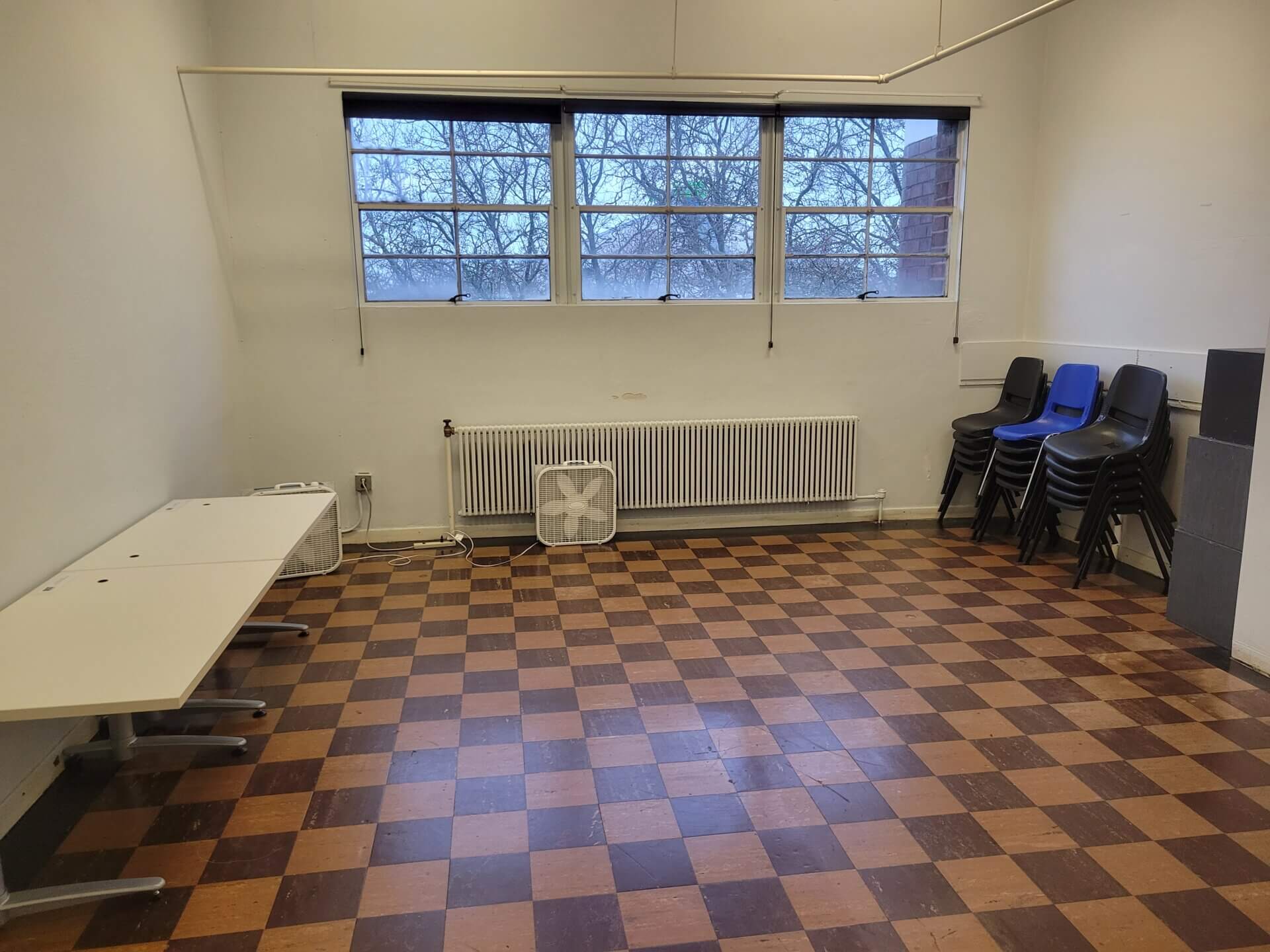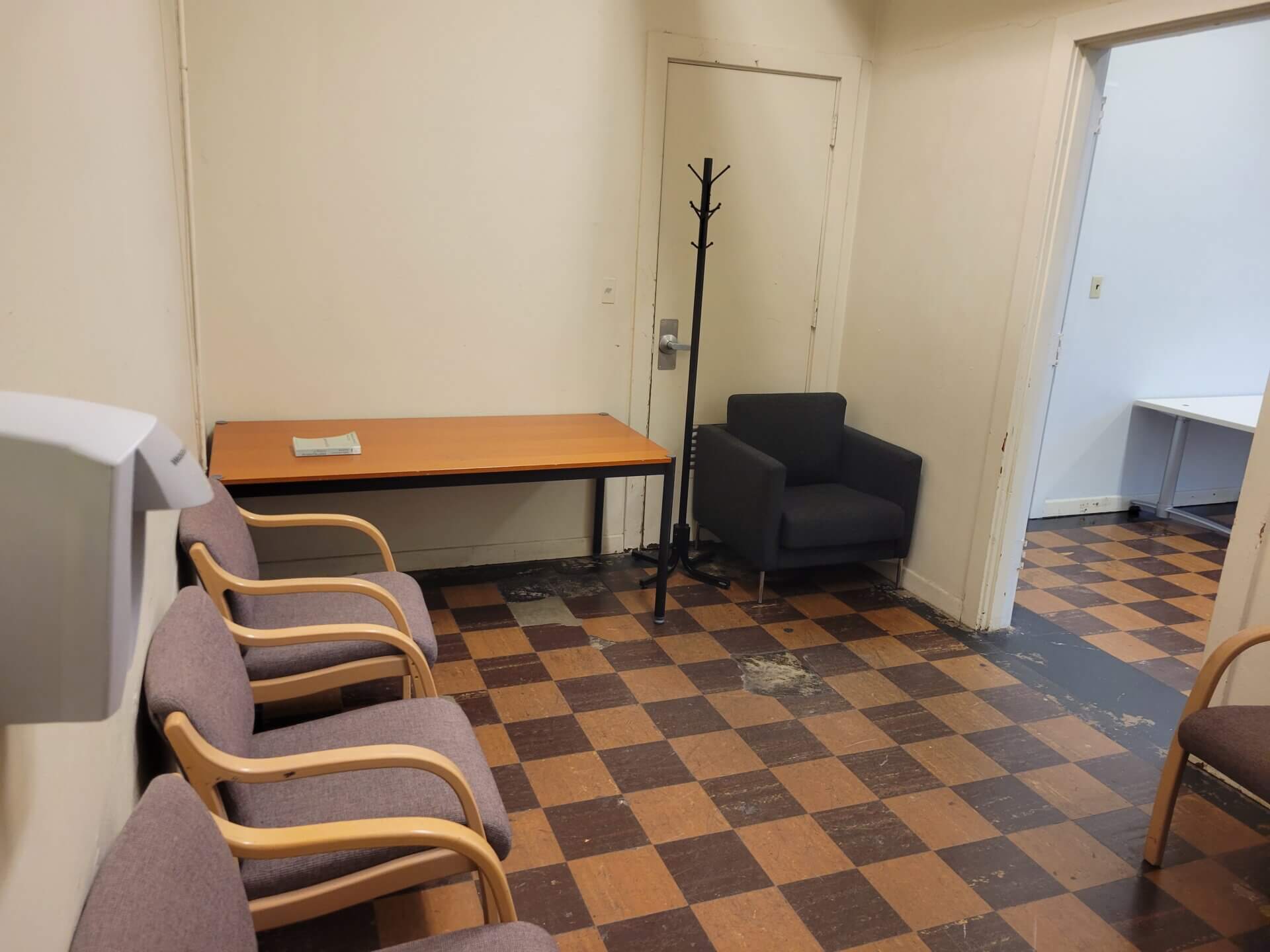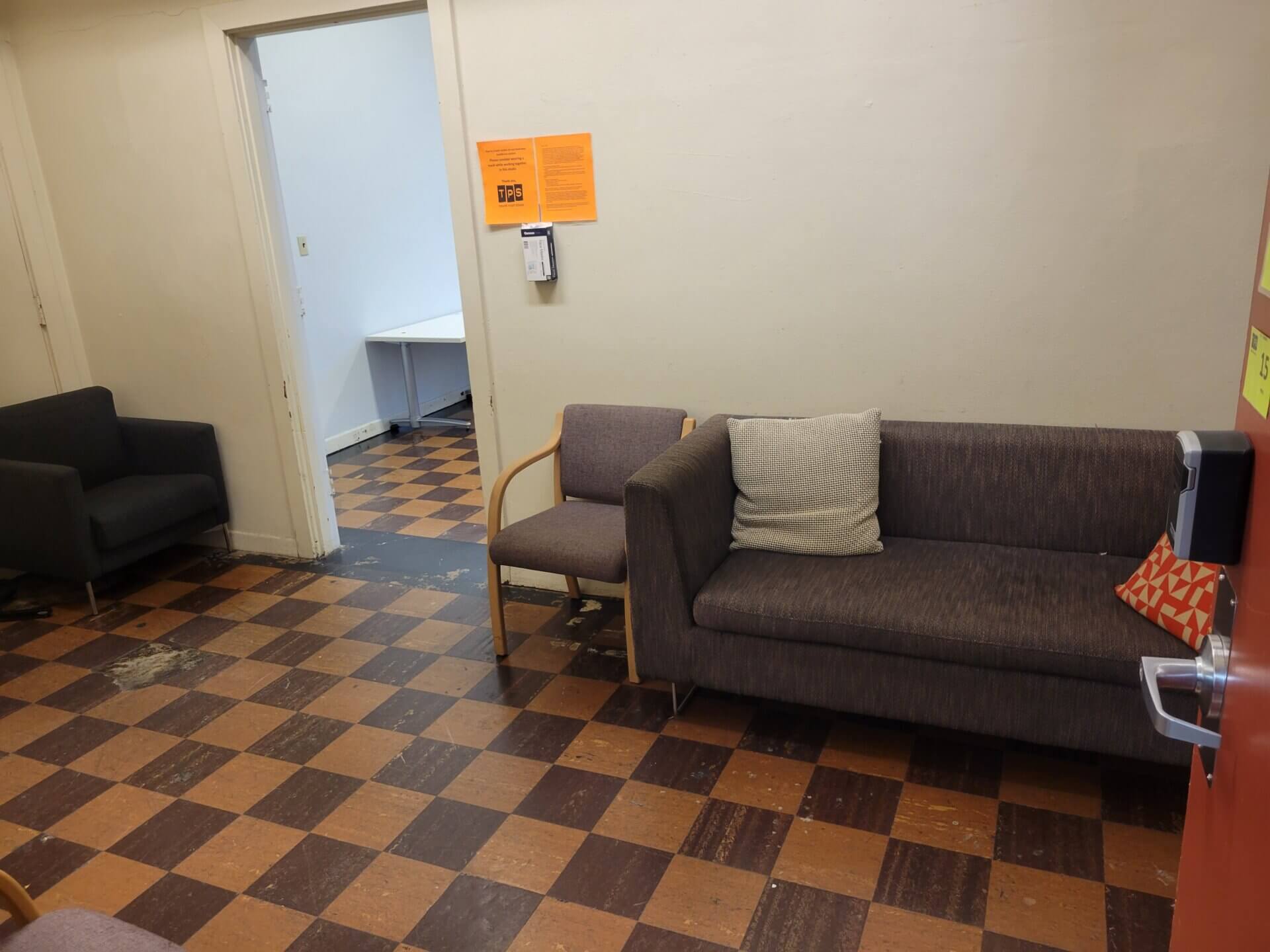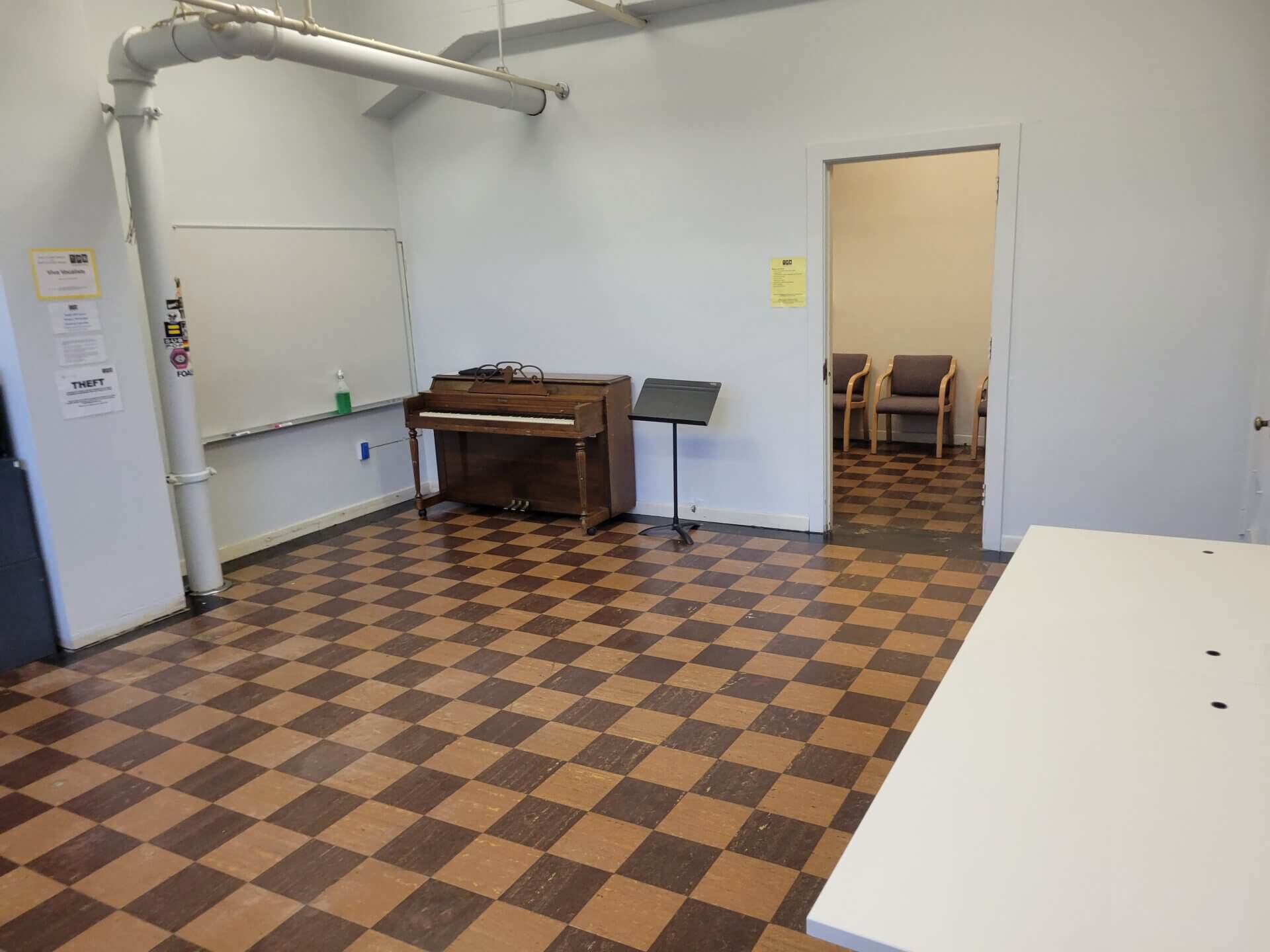 The new Studio F is a smaller space that we are making available to rent, due to the high demand on weekday evenings. It is at the start of the narrow hallway which leads to Studio G, Theatre4 and Studio I. It is 18’x17′, with a smaller anteroom, has a capacity of 15 people, and a spinet piano. It has 15 chairs, three rehearsal cubes, and 1 table, as well as some additional furniture in the anteroom.