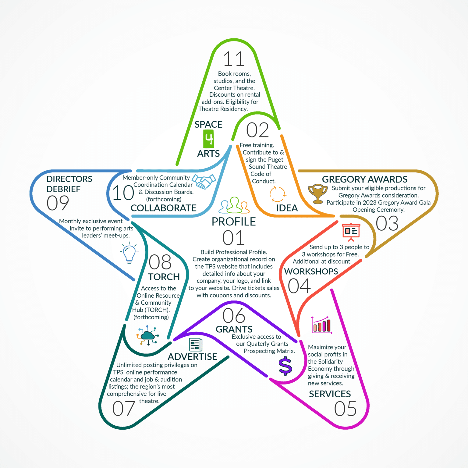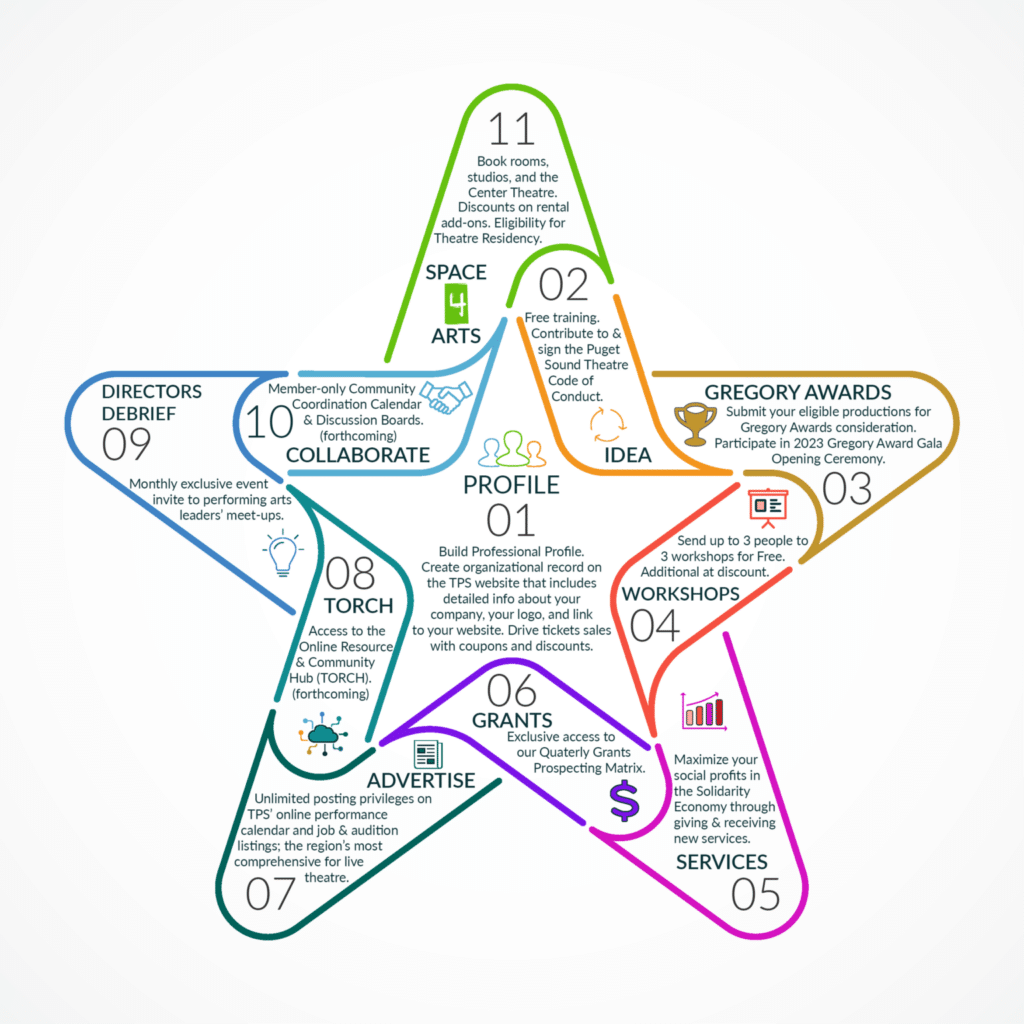 Become a TPS Star Organization! Does your company have performers, designers, or technicians? Then this is the TPS Membership type for you. Organizational Memberships are designed for performing arts organizations around Puget Sound and the organizations that directly support them. There are 7 Organizational Membership Levels, and dues are based on annual budget, except for our newest introductory level for those which have only been in existence for 18 months or less. Organizational Membership is best for those organizations that want direct connections to those in the industry including traditional theatre, admin support, burlesque, choral, dance, improv, lightsaber, opera, foundations, symphony, and more. TPS supports all stages of the arts!