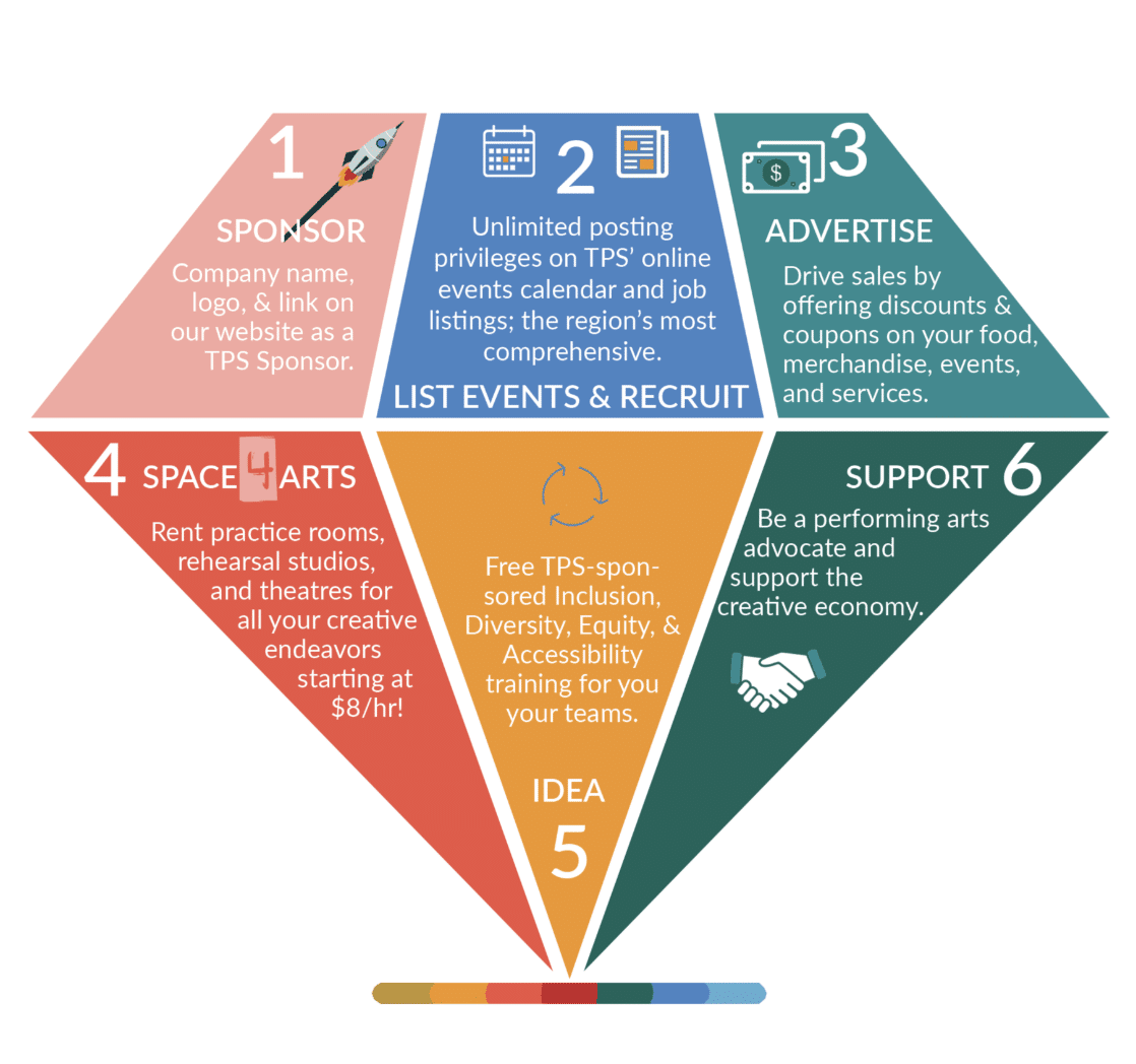 Become a TPS supporter through Associate Membership. For essentially the cost of 1 ad, receive a full year’s worth of advertising for your business. Associate Memberships are developed for non-performing arts businesses and organizations. This membership is perfect for arts-adjacent organizations and businesses who directly or indirectly support and want to support performing arts in Puget Sound. Associate Membership is best for businesses such as restaurants, bars, art supply stores, theatrical equipment manufacturers, and others. This is the level for those who want to list events, post job openings, offer discounts to TPS Members, and advertise their programs, services, and products through TPS marketing & media outlets.
